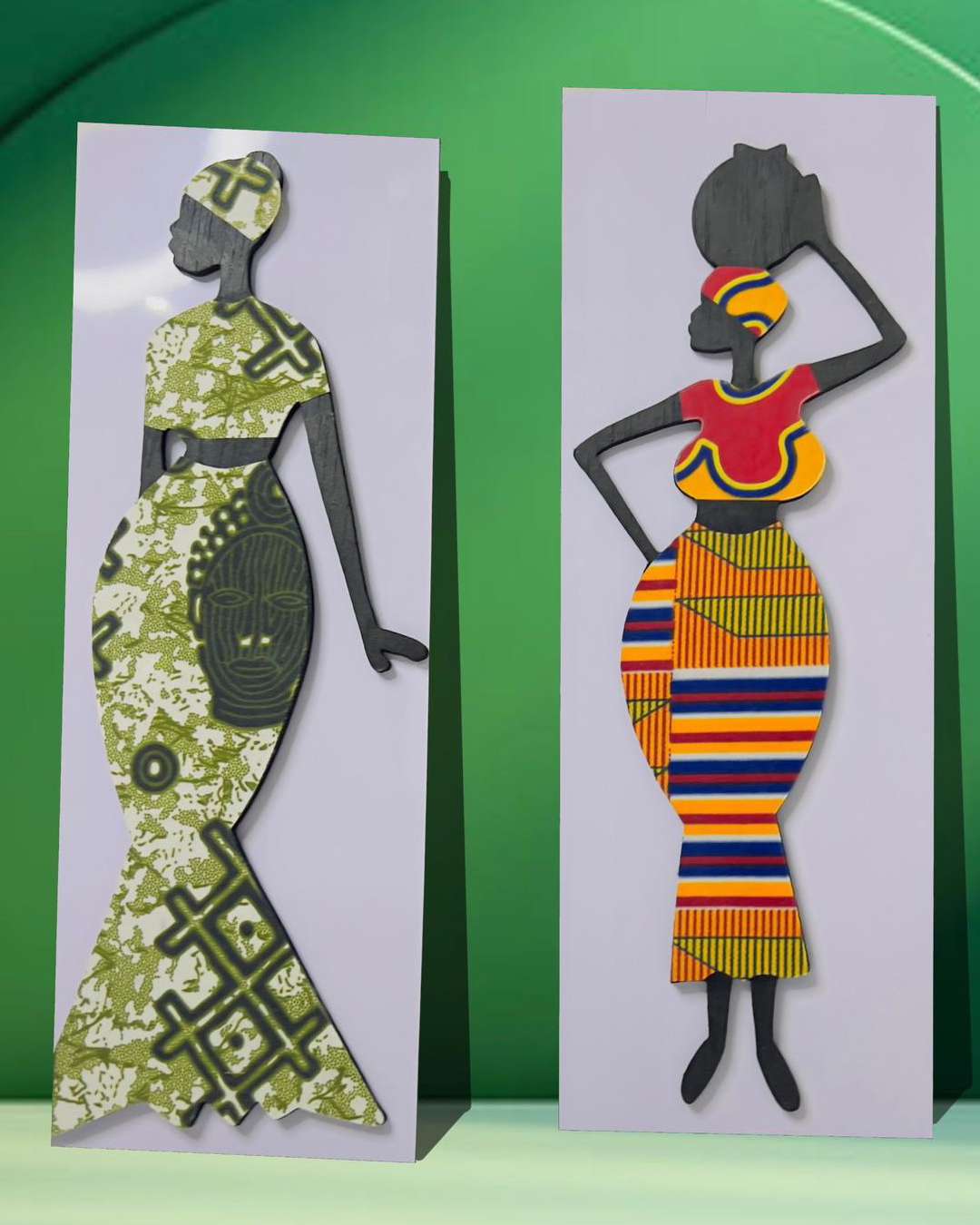 This exclusive wall art showcases the beauty and industrious spirit of African women in an abstract form. Crafted from wood, Formica, and fabrics, it's an ideal gift or decorative piece for homes, hotels, and offices.