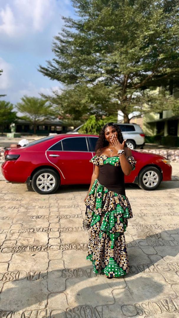 This gown showcases a unique three-layer design crafted from vibrant Ankara fabric. Ideal for special occasions, it blends elegance with cultural richness.
