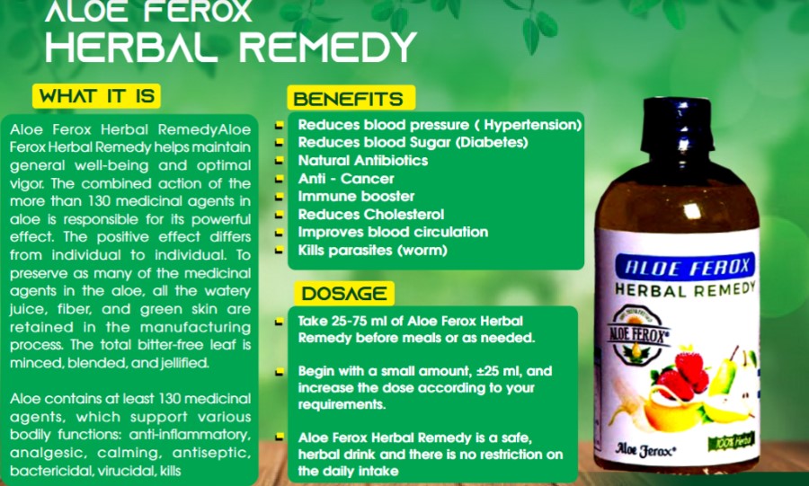 Bioferox Herbal Remedy is a natural Aloe Ferox herbal drink formulated to maintain general well-being, vitality, and optimal vigor. Each 500ml bottle contains the full spectrum of Aloe Ferox leaf — including juice, fiber, and green skin — carefully processed to retain more than 130 medicinal agents that support numerous bodily functions. Key Benefits: • Reduces Blood Pressure: Supports healthy cardiovascular function. • Reduces Blood Sugar: Helps manage diabetes naturally. • Natural Antibiotic & Immune Booster: Strengthens the body’s defenses against infections. • Anti-Cancer & Anti-Inflammatory: Protects cells and fights inflammation. • Reduces Cholesterol & Improves Blood Circulation: Promotes heart and vascular health. • Kills Parasites (Worms): Supports digestive health. • Supports General Wellness & Vigor: Maintains energy, vitality, and overall well-being. Why Choose Bioferox Herbal Remedy? Bioferox is made from 100% natural Aloe Ferox, preserving all the medicinal agents in the leaf. Its holistic action promotes anti-inflammatory, antiseptic, bactericidal, virucidal, and analgesic benefits, making it an ideal daily health drink for those seeking natural wellness support. Effects may vary individually, allowing your body to adjust naturally to the remedy.