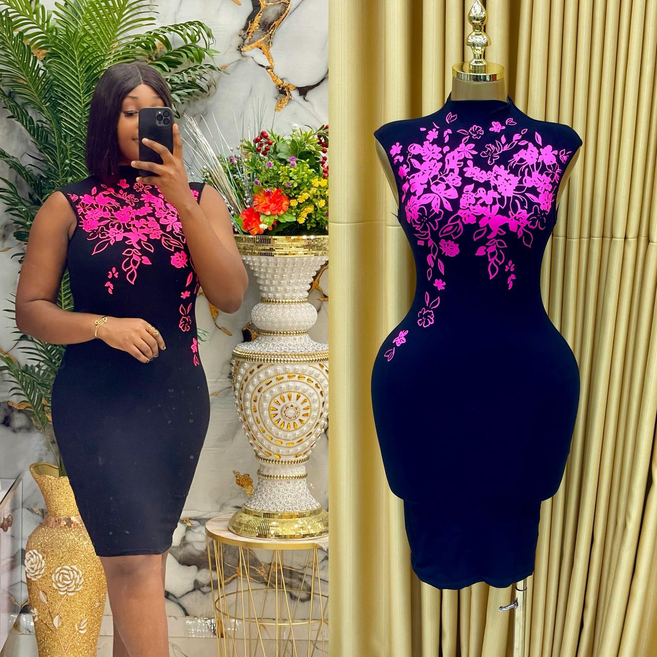 This sleek black bodycon dress features delicate pink flower details at the upper part, adding a touch of femininity. Perfect for evening outings or special occasions, it hugs the body in all the right places. The versatile design allows for easy styling with various accessories.