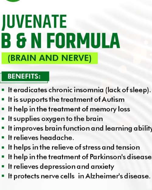 Juvenate Brain and Nerve Boost memory and repair damaged nerves. Juvenate Brain & Nerve provides natural relief for anxiety, insomnia, and neuropathy. Enhance your mental clarity today. health benefits of Juvenile Brain and Nerve Cognitive Enhancement: Juvenate Brain and Nerve Directly supports the treatment of memory loss and mental fatigue. Nerve Repair: Juvenate Brain and Nerve Helps shield nerve cells from damage, supporting neuropathy recovery. Insomnia Relief: Juvenate Brain and Nerve Relaxes the nervous system for deep, restorative sleep. Mood Support: Juvenate Brain and Nerve Acts as a natural aid for stress, anxiety, and depression. Complete Your Routine (Customers Also Bought): Juvenate BP & Heart: Proper blood flow is vital for brain health. This combo ensures your brain gets the oxygen it needs to thrive. ⭐⭐⭐⭐⭐ Testimonial: "I feel sharp again and my neuropathy is gone!" — Michael B.