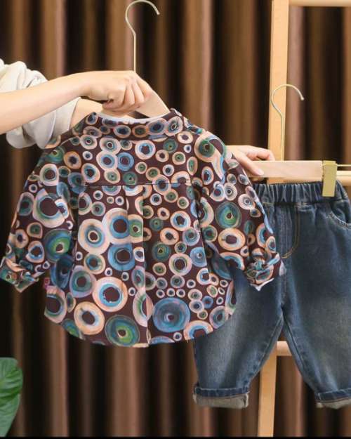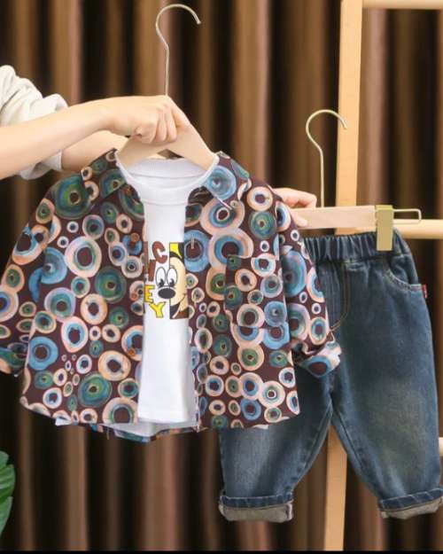 A trendy kids’ set with a patterned jacket, cartoon tee, and denim pants. Available 💛 for ages 2-6 years