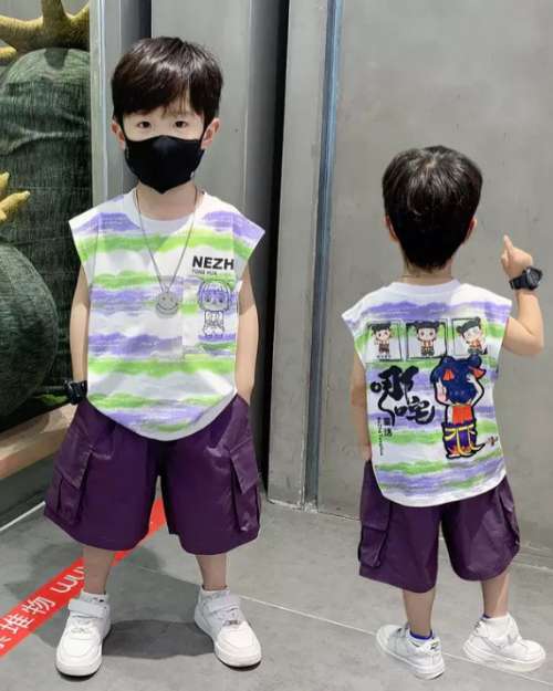 A cool kids’ outfit with a striped sleeveless tee and purple cargo shorts. Available in 2 colors, 💜 and 💚 Ages 2-6 years