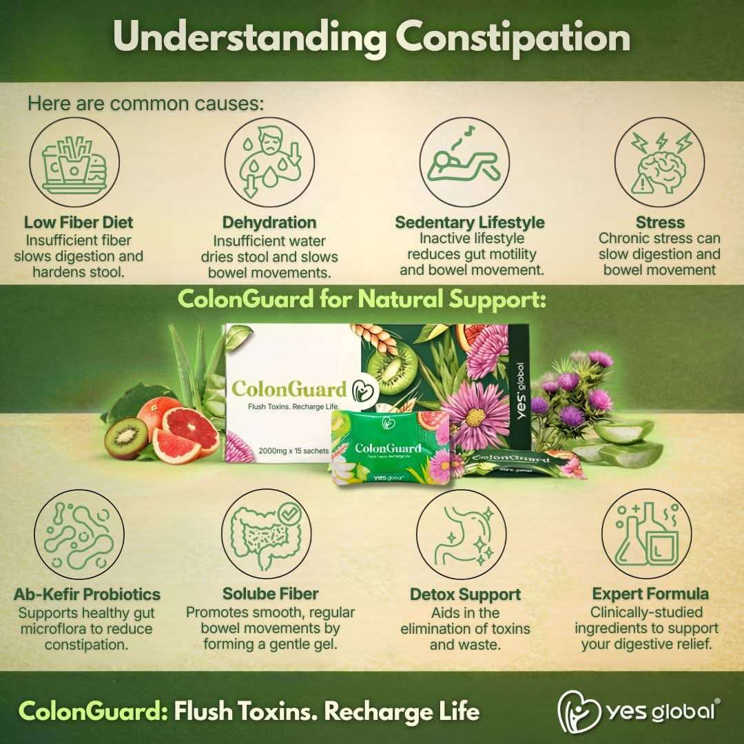 Did you know that your everyday lifestyle could be the "silent brake" on your digestion? 🛑✨ Common factors like a low-fiber diet, dehydration, and even daily stress can slow down your gut motility, leading to that heavy, uncomfortable feeling. When your digestive rhythm is off, it doesn't just affect your stomach—it can drain your energy and impact your overall vitality! 🌱💪 Reset your system with ColonGuard. Our expert formula is designed to "Flush Toxins and Recharge Life" by providing na