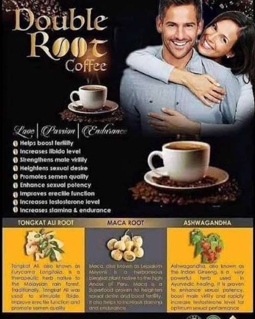 Double Root Coffee is 100% organic with no sides effectsThe Ultimate Fuel for Experience the dual-action power of Double Root Coffee. Infused with Maca and Tongkat Ali, this 100% Arabica blend is designed to naturally boost testosterone, enhance stamina, and revitalize your peak performance Modern Man. Are you feeling the drain of a high-pressure lifestyle? Double Root Coffee isn't just a morning ritual; it’s a biological upgrade. By combining the ancient potency of Peruvian Maca with the virility-boosting power of Tongkat Ali, this coffee targets the root causes of fatigue and low drive. Double Root Coffee: Promotes healthy hormone levels and improves blood circulation. Double Root Coffee: Increased sexual desire, better semen quality, and the endurance to stay on top of your game from the boardroom to the bedroom. Double Root Coffee for men, natural testosterone booster, libido enhancement coffee, Maca and Tongkat Ali blend, male vitality coffee. Health Benefits of Double Root Coffee Double Root Coffee for Hormone Balance: The primary benefit of Double Root Coffee is its ability to stimulate endogenous testosterone production through its potent Maca and Tongkat Ali blend. Double Root Coffee for Fertility: Regular consumption of Double Root Coffee is linked to improved sperm motility and reproductive health in men. Double Root Coffee for Prostate Support: The herbal extracts in Double Root Coffee contain bio-compounds that support long-term prostate wellness and urinary function. Double Root Coffee for Stress Management: By balancing the endocrine system, Double Root Coffee helps lower cortisol, allowing for a calmer, more focused mindset. Double Root Coffee for Bone Strength: The hormonal optimization provided by Double Root Coffee assists in maintaining healthy bone density and skeletal integrity.
