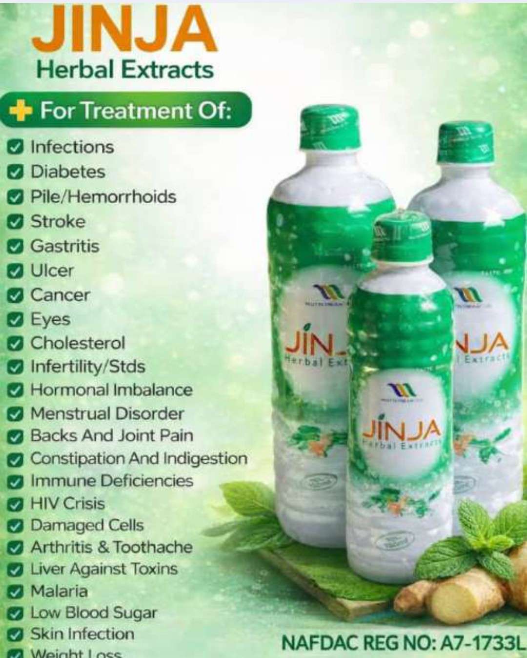 Unlock a more vibrant you with the botanical strength of Jinja Herbal Extract. In a world of synthetics, we go back to nature. Jinja is a premium blend of traditional herbal extracts, NAFDAC approved (A7-4301) and formulated to support your body's natural balance and vitality. Whether you're looking to boost your daily wellness or support a healthier lifestyle, Jinja is the trusted choice for thousands. ✅ 100% Herbal Extracts: Pure, traditional botanical ingredients. ✅ Trusted Quality: NAFDAC Registered & Approved (A7-4301). ✅ Designed for Vitality: Formulated to support your body's natural balance. Join the thousands who trust Jinja as their daily wellness choice. 📞 Call or WhatsApp us now: 07032870312 ✨ We deliver nationwide! [Shop Now] – Click below to order your bottle and start your natural wellness journey today!