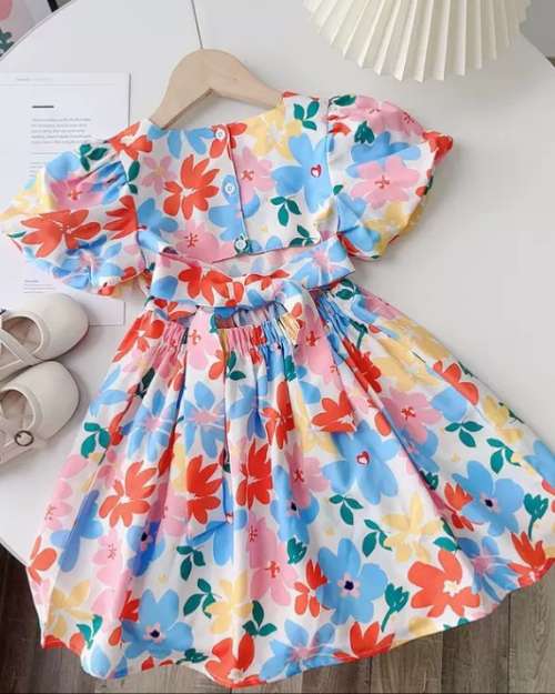 A colorful floral kids’ dress with puff sleeves and a cute waist tie. Available 💛 Ages 2-6 years