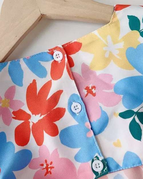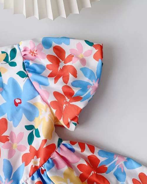 A colorful floral kids’ dress with puff sleeves and a cute waist tie.