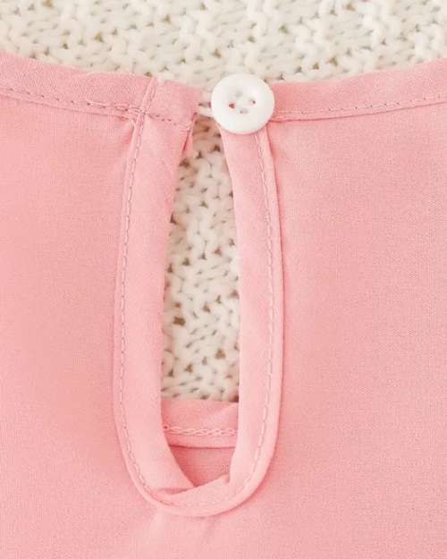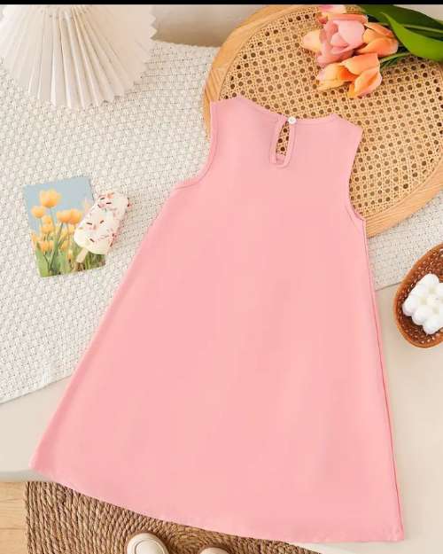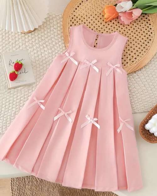 A soft pink sleeveless children’s dress with a pleated skirt, decorated with small pink bow accents. It has a round neckline and a gentle, elegant look, delicate vibe.
