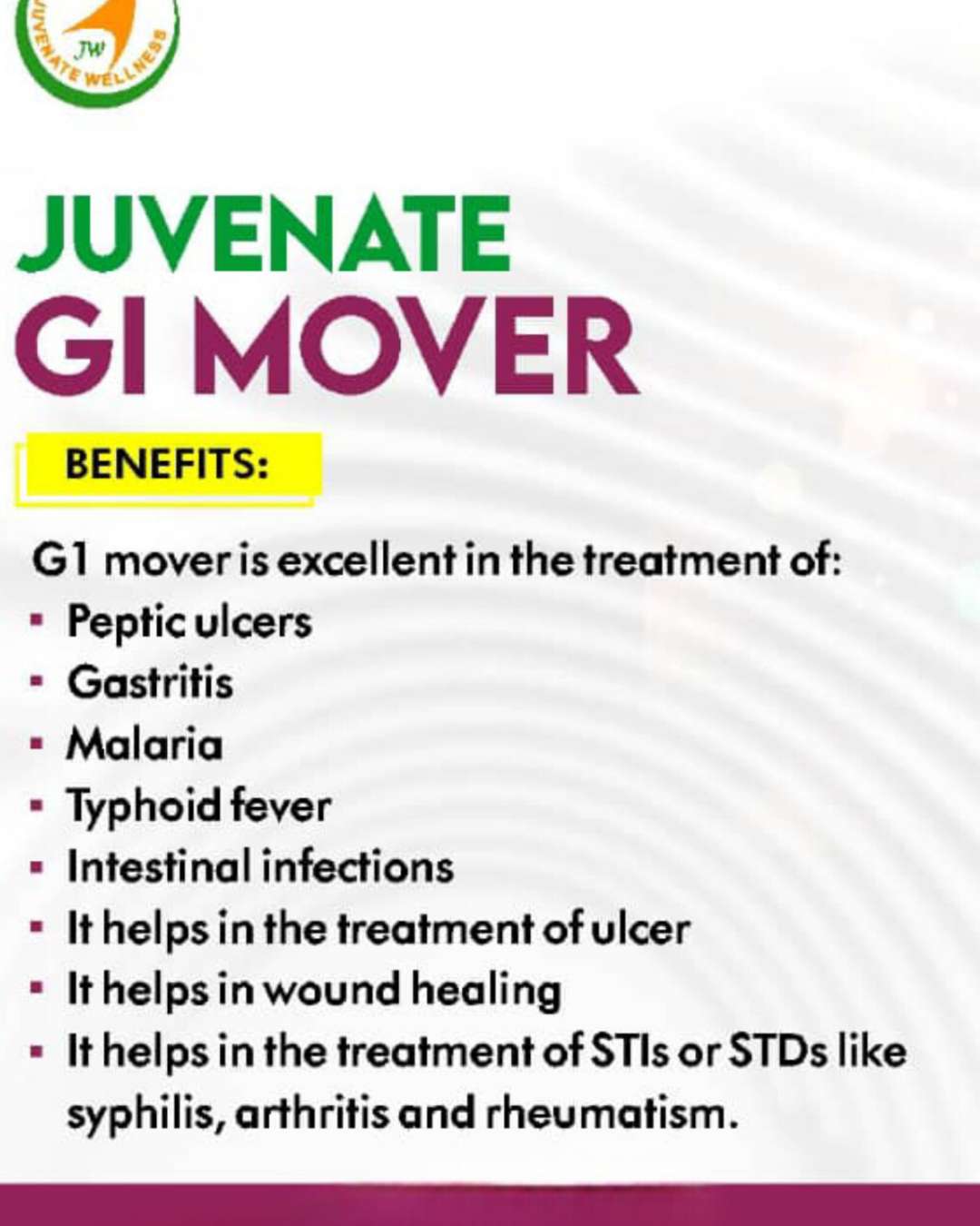 Health Benefits of Juvenate GI Mover ​Juvenate GI Mover is a liquid herbal supplement formulated to support the digestive system and address various internal infections. key benefits include: ​Digestive Support: It is used in the treatment of Peptic Ulcers and Gastritis, helping to soothe the stomach lining. ​Infection Fighter: It is promoted for the treatment of Malaria, Typhoid fever, and various Intestinal infections. ​Healing Properties: The formula aids in overall wound healing and helps manage chronic inflammatory conditions. ​Broad Systemic Support: It is indicated for the treatment of STIs or STDs (such as syphilis) and inflammatory joint issues like arthritis and rheumatism. ​Gastrointestinal Regulation: It helps improve overall gut health and regulates bowel activity. JUVENATE also offer: ​Juvenate Detox (Digestive Cleansing) ​Juvenate Blood Purifier (Toxin Removal) ​Juvenate Women’s Health (Hormonal Balance), JUVENATE Men’s Health (Vitality & Prostate) JUVENATE ​Lymphatic (Immune Postrate Support), JUVENATE Brain & Nerve (cognitive health) #TyphoidRelief #NaturalUlcerCure #HerbalMedicine #Detox #JuvenateGIMover #JuvenateWellness #HealthyLiving