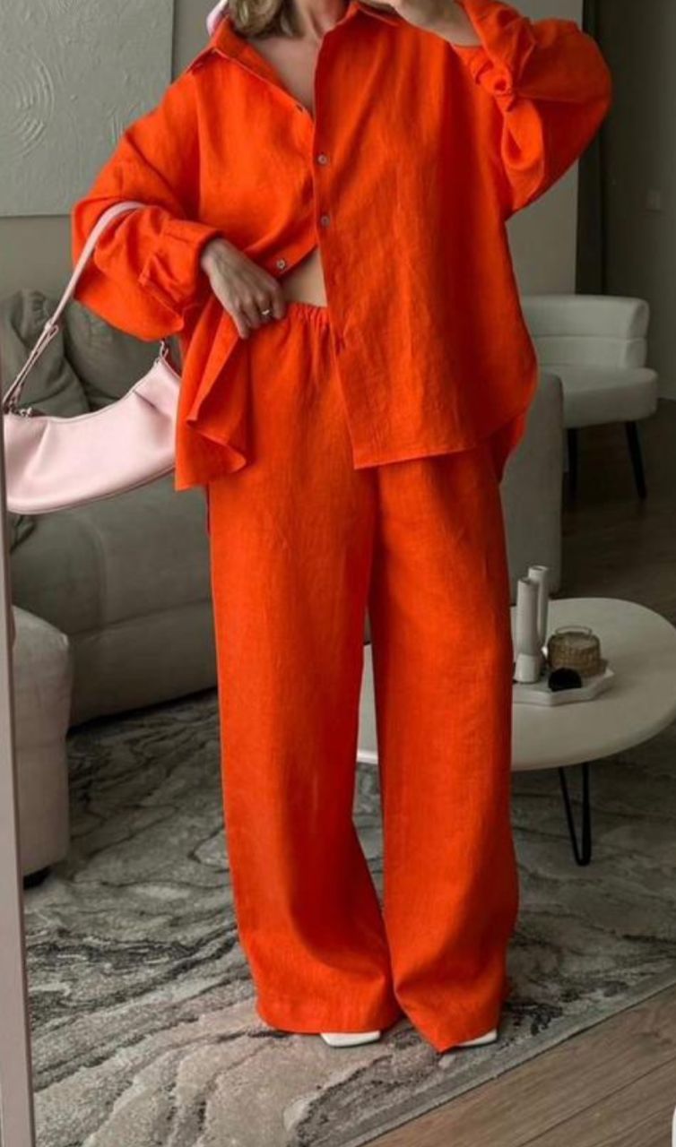 This elegant linen two-piece set features a vibrant orange hue, perfect for warm weather outings. The lightweight fabric ensures comfort while maintaining a chic look. Ideal for casual gatherings or relaxed days at home.