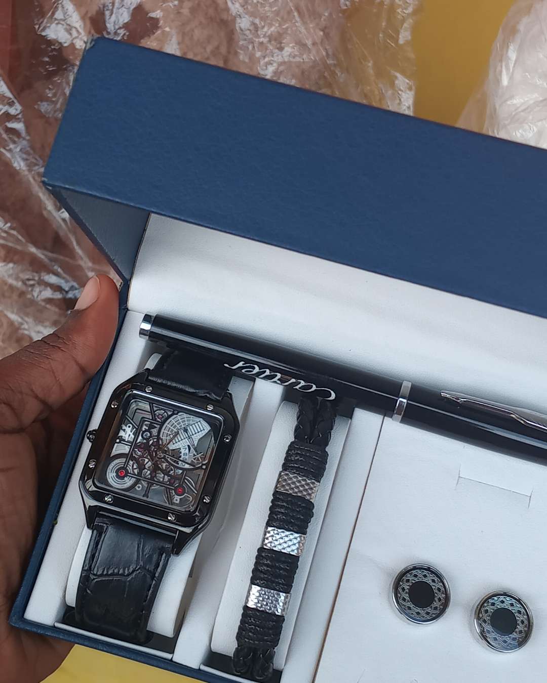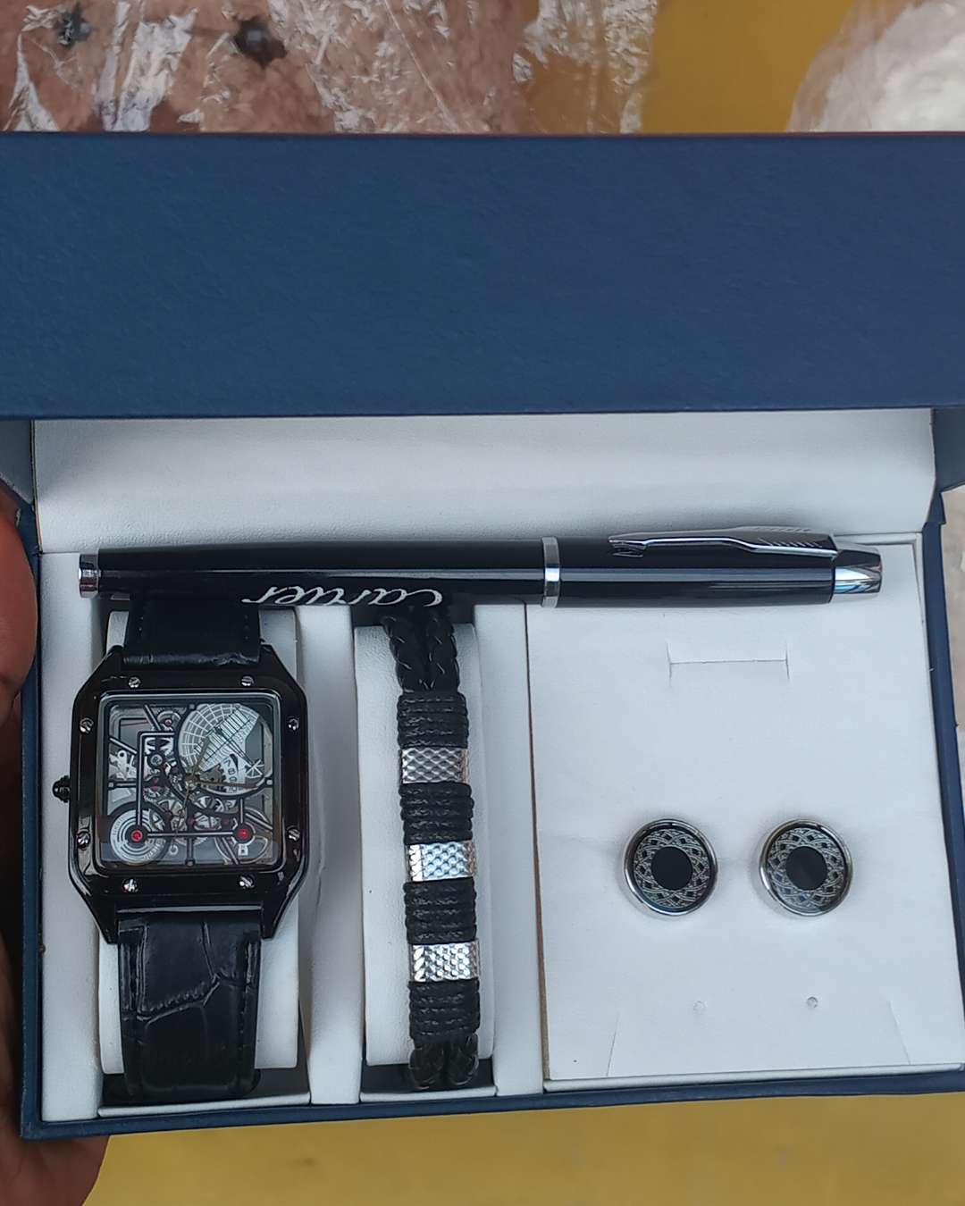 This curated gift set includes a stylish watch, sleek sungl...