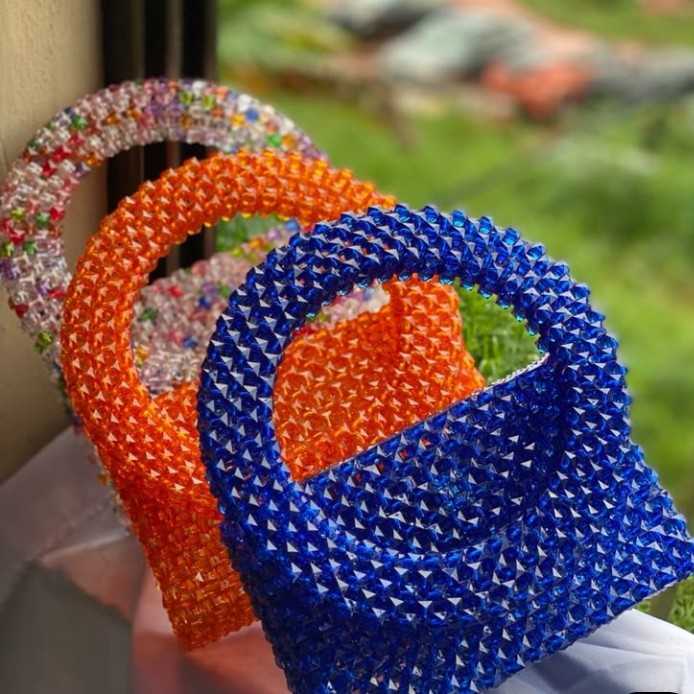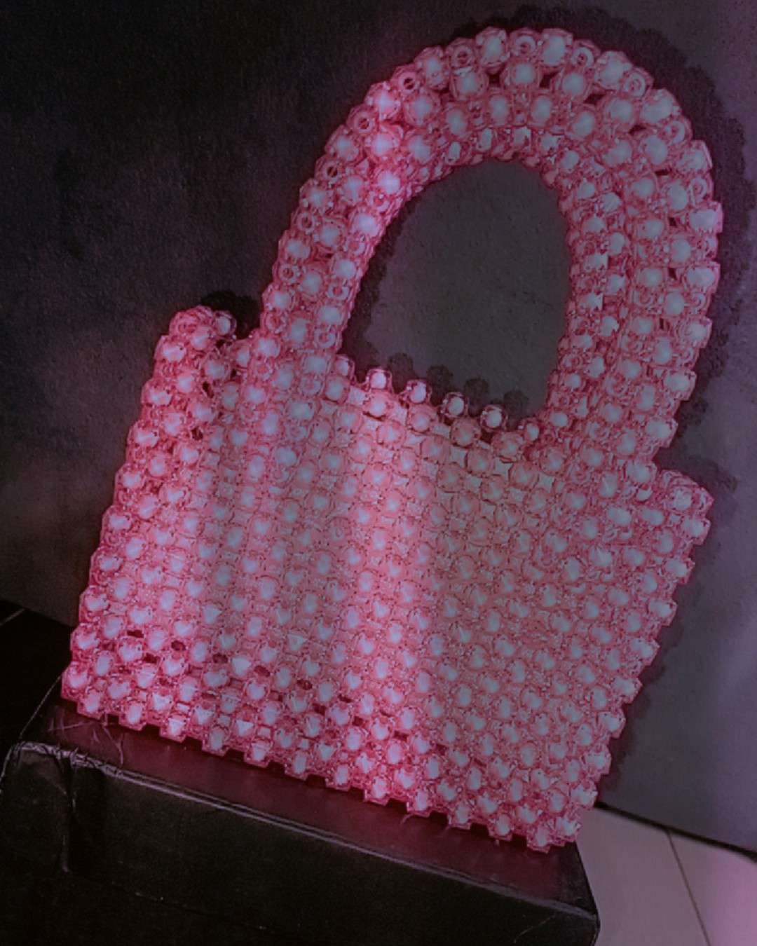 This handmade beaded bag is crafted with crystal sugar beads, creating a unique and elegant accessory. Its compact box shape makes it perfect for carrying your essentials.