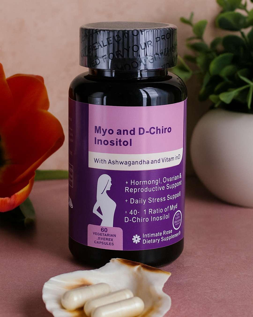 Experience natural hormone balance, stress relief, and reproductive wellness with Inositol Capsules — the only inositol blend enhanced with Ashwagandha and Vitamin D3 for complete women’s wellness. This premium supplement supports hormonal harmony, mood stability, ovarian function, and egg quality — helping you feel your absolute best inside and out. --- Key Benefits ✅ Supports Hormone Balance & Fertility – Promotes ovarian health, menstrual regularity, and egg quality. ✅ Boosts Mood & Reduce