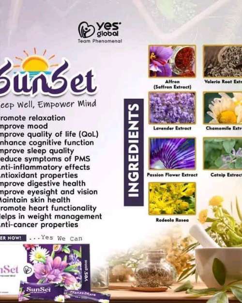 Sunset is a natural health supplement from Yes Global designed to help the body relax, reduce stress, and improve sleep quality. It is specially formulated for people who struggle with anxiety, tiredness, or poor sleep patterns. In today’s fast-moving world, many people find it hard to unwind after a long day, and Sunset is created to support a calm mind and restful night.