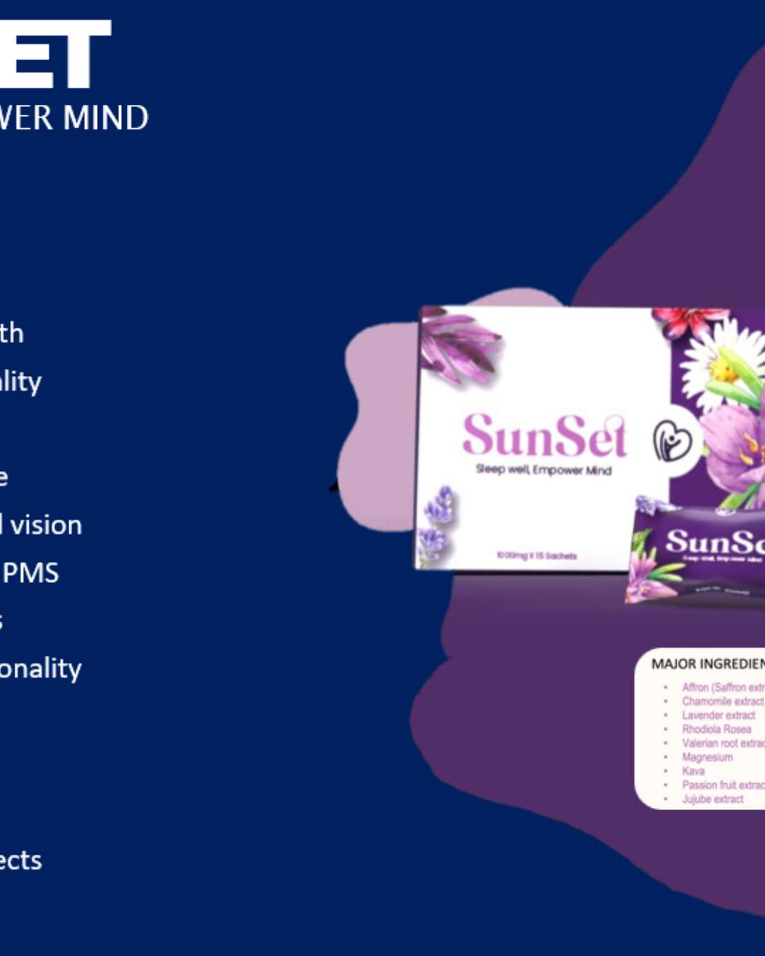 SunSet is designed to help alleviate stress, anxiety, and sleep disorders. This wellness product supports heart health, boosts mood, and enhances relaxation for a better night's sleep.