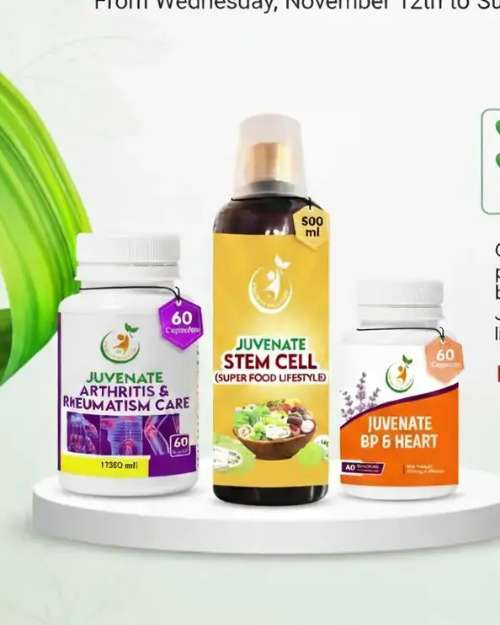 Reclaim your active lifestyle with the ultimate Juvenate Wellness Combo. This powerful trio combines the SLT Stem Cell Formula to repair damaged cells, BP & Heart capsules to support cardiovascular strength, and Arthritis & Rheumatism Care to restore pain-free mobility. It’s a 100% organic "Super Food" regimen designed to detoxify your system, regulate blood pressure, and eliminate joint discomfort from the inside Total Wellness in One Bundle Why settle for one solution when you can give your body complete care? This trio combines the power of nature and science to target your most vital health needs. What’s Inside the Combo? Juvenate Arthritis & Rheumatism Care: Designed to soothe joint discomfort, reduce inflammation, and help you move freely again. Juvenate BP & Heart: Supports healthy blood pressure levels and provides essential nutrients for a strong, resilient cardiovascular system. Juvenate Stem Cell (SLT Formula): The "Super Food" for your cells. It helps rejuvenate your body’s natural repair system and boosts overall vitality. Why Choose This Bundle? ✅ Synergistic Action: The products work better together to improve circulation and joint health simultaneously. ✅ Natural Support: Formulated with high-quality ingredients for a "Super Food" lifestyle. ✅ Convenience: A complete daily regimen to keep you active and healthy. Invest in your health today—because your body deserves to feel young again