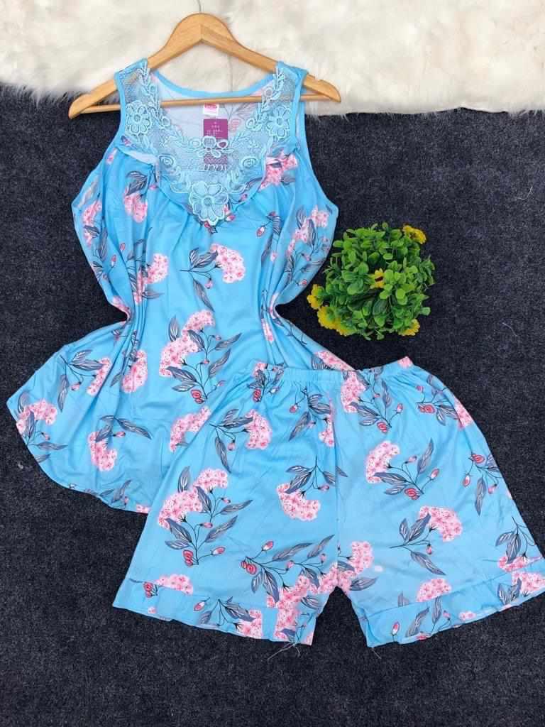 This a blue sleeveless flower happy Nightie that comes with short for all body size's Price:6500
