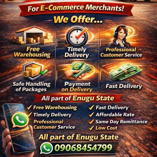 Are you an E-commerce marchants and you are finding it difficult in making sales cus your customer said payment on delivery.. worry no more VC Express is here for you.. We offer Free Warehousing, Payment on delivery, Fast Delivery Same day Remittance Low cost.. Locations we cover All parts of Enugu For more info Whatsapp/Call 09068454799 Let's deal π€π€